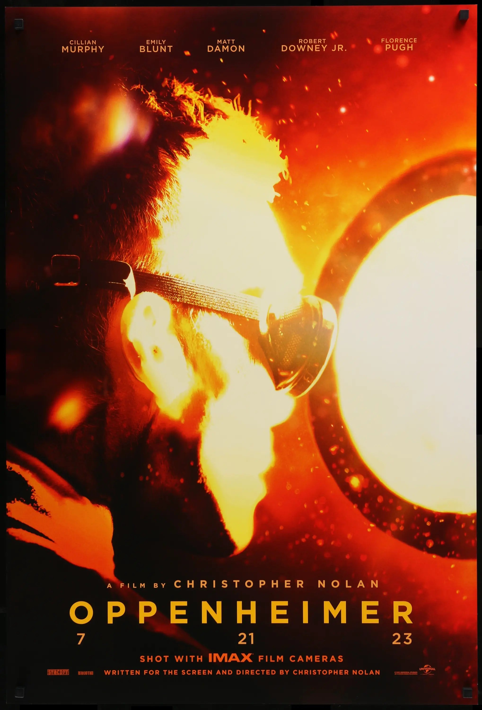 • This is an original, double-sided, teaser one-sheet movie poster from 2023 for Oppenheimer starring Cillian Murphy, Emily Blunt, Matt Damon, Robert Downey Jr., Florence Pugh, Josh Hartnett, and Casey Affleck. Christopher Nolan directed the historical drama.